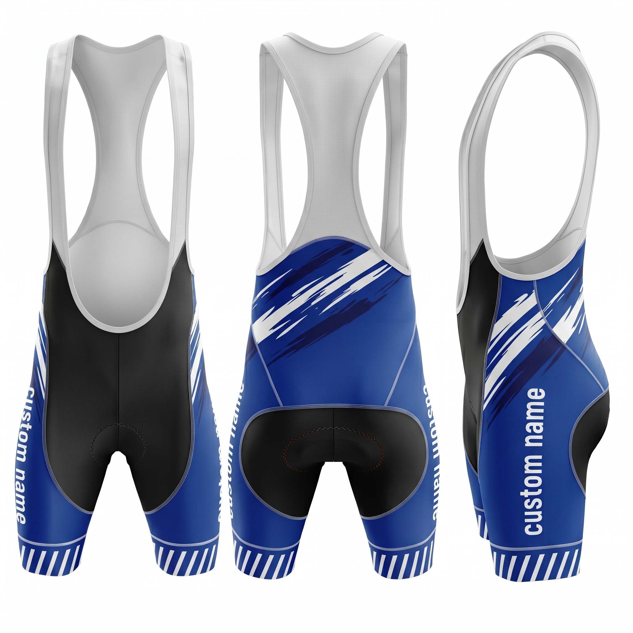 Unleash your inner champion with our Custom Name Performance Bike Bib Shorts! These aren’t just any bike bib shorts; they’re a statement of your dedication and passion for cycling. Featuring a striking royal blue racing style design with bold white accents and sleek stripes, these bike bib shorts are as stylish as they are functional. Plus, you can personalize them with your name!