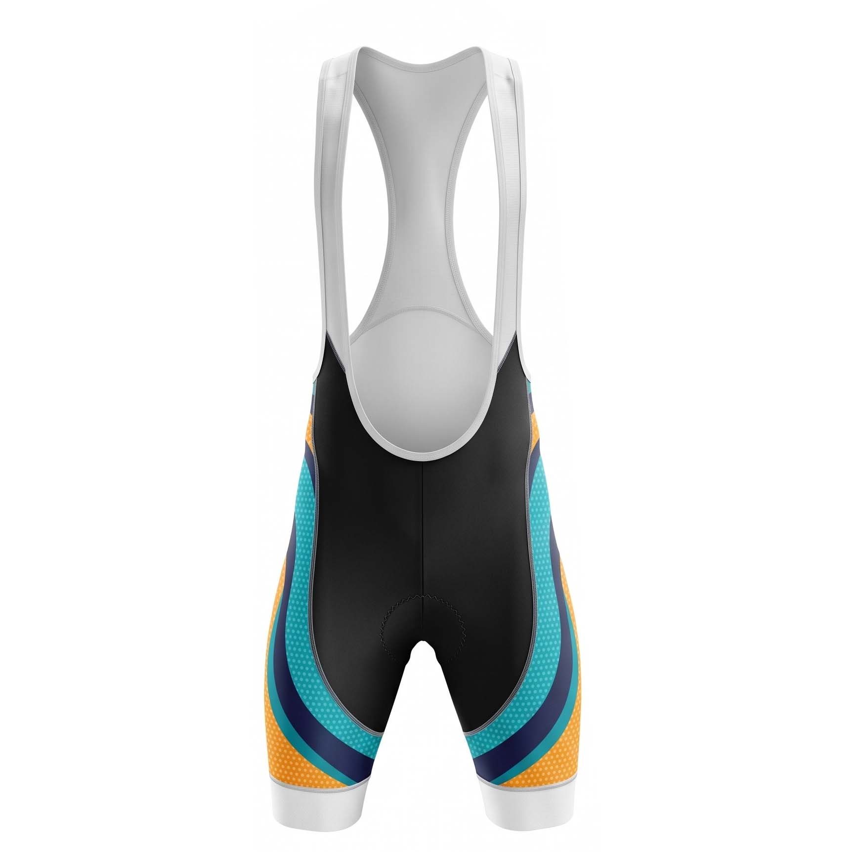 Ready to turn heads on your next ride? These vibrant cycling bib shorts aren’t just about looks; they’re engineered for performance and comfort. The eye-catching design features bold curves in turquoise, navy, and orange with a subtle dotted texture, all set against a sleek black background. The white bib straps provide a clean, modern contrast.