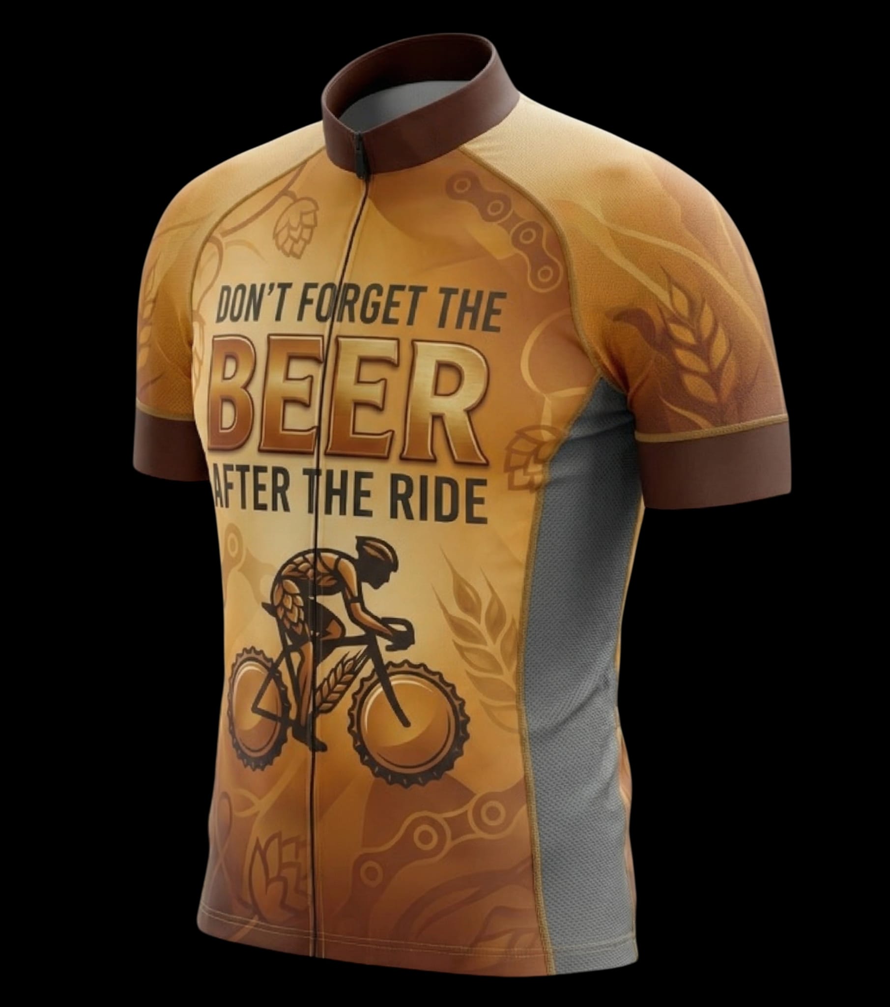 Ready to ride and reward yourself afterward? This unique cycling jersey is a must-have for any cyclist who appreciates a cold brew after a long ride. The design features a golden-brown color palette, reminiscent of your favorite beer, complete with hop and barley motifs, and a cyclist riding through what appears to be beer hops and beer caps. The bold text “Don’t Forget The Beer After The Ride” leaves no doubt about your post-ride priorities.