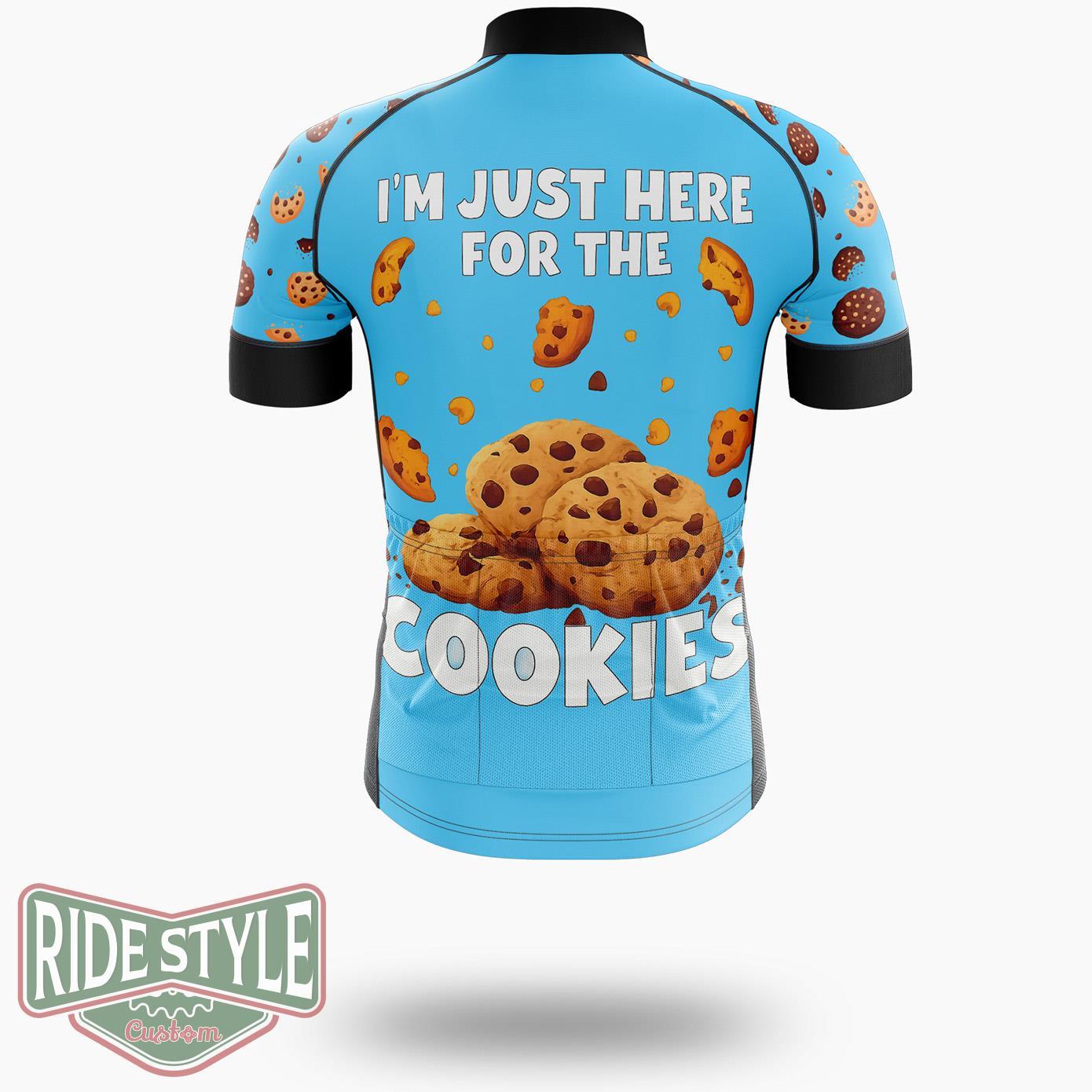The design features a playful and eye-catching theme centered around chocolate chip cookies. The primary color appears to be a vibrant teal, providing a refreshing and energetic backdrop. Scattered throughout are delightful illustrations of chocolate chip cookies, adding a touch of whimsy and fun. The text “I’m Just Here For The Cookies” is prominently displayed, reinforcing the humorous intent. The composition suggests a comfortable and breathable fit, ideal for long rides. The overall aesthetic is lighthearted and inviting, making it a standout piece in the world of cycling jerseys.