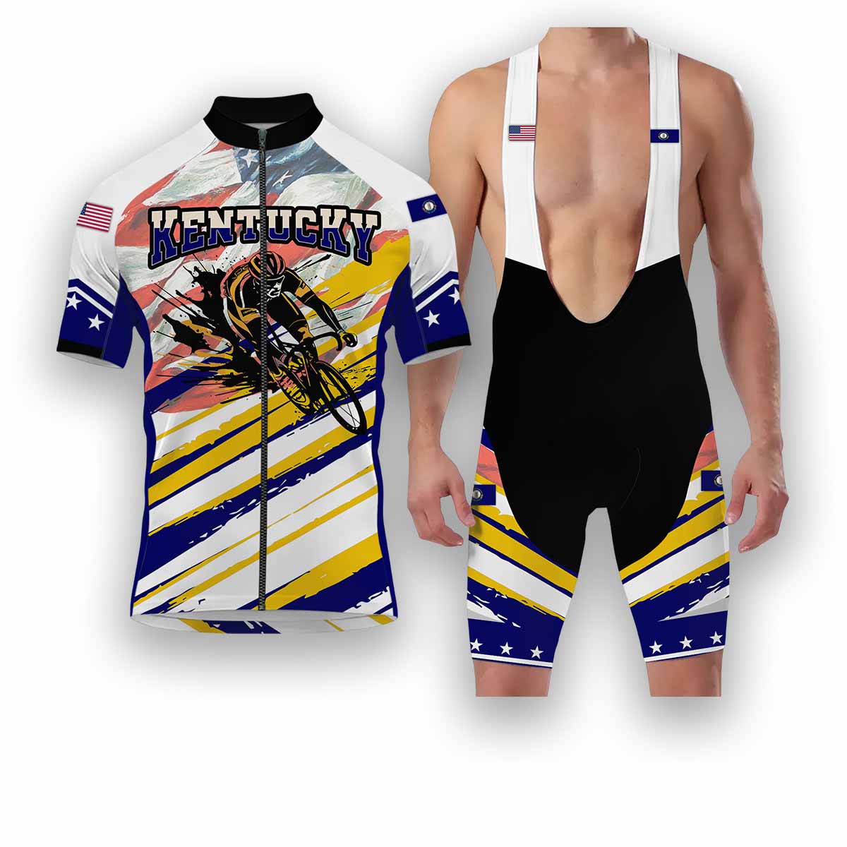 Are you a proud Kentuckian cyclist? Show your state and national pride with our Kentucky States Cycling Jersey. This premium cycling jersey features a vibrant USA flag design, perfect for both men and women. Crafted for optimal performance and comfort, this full kit provides a superior riding experience.