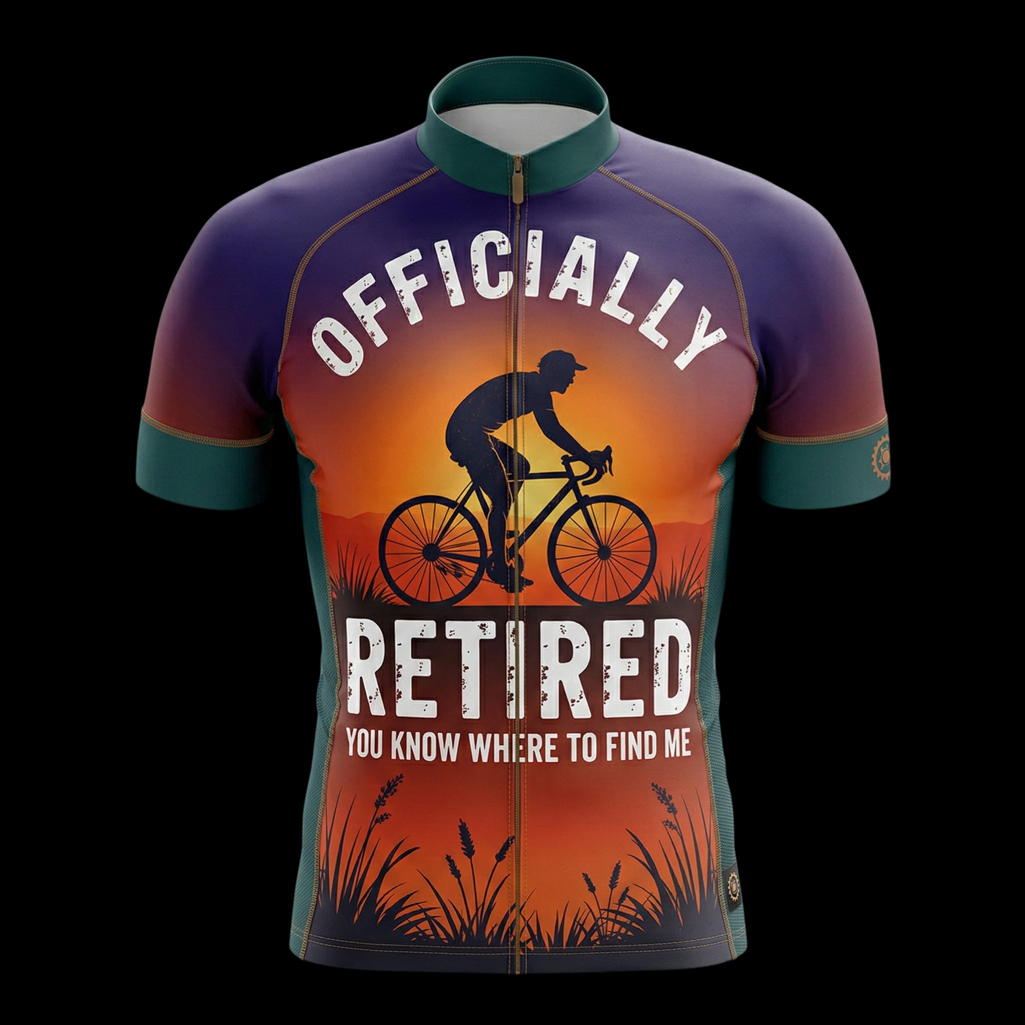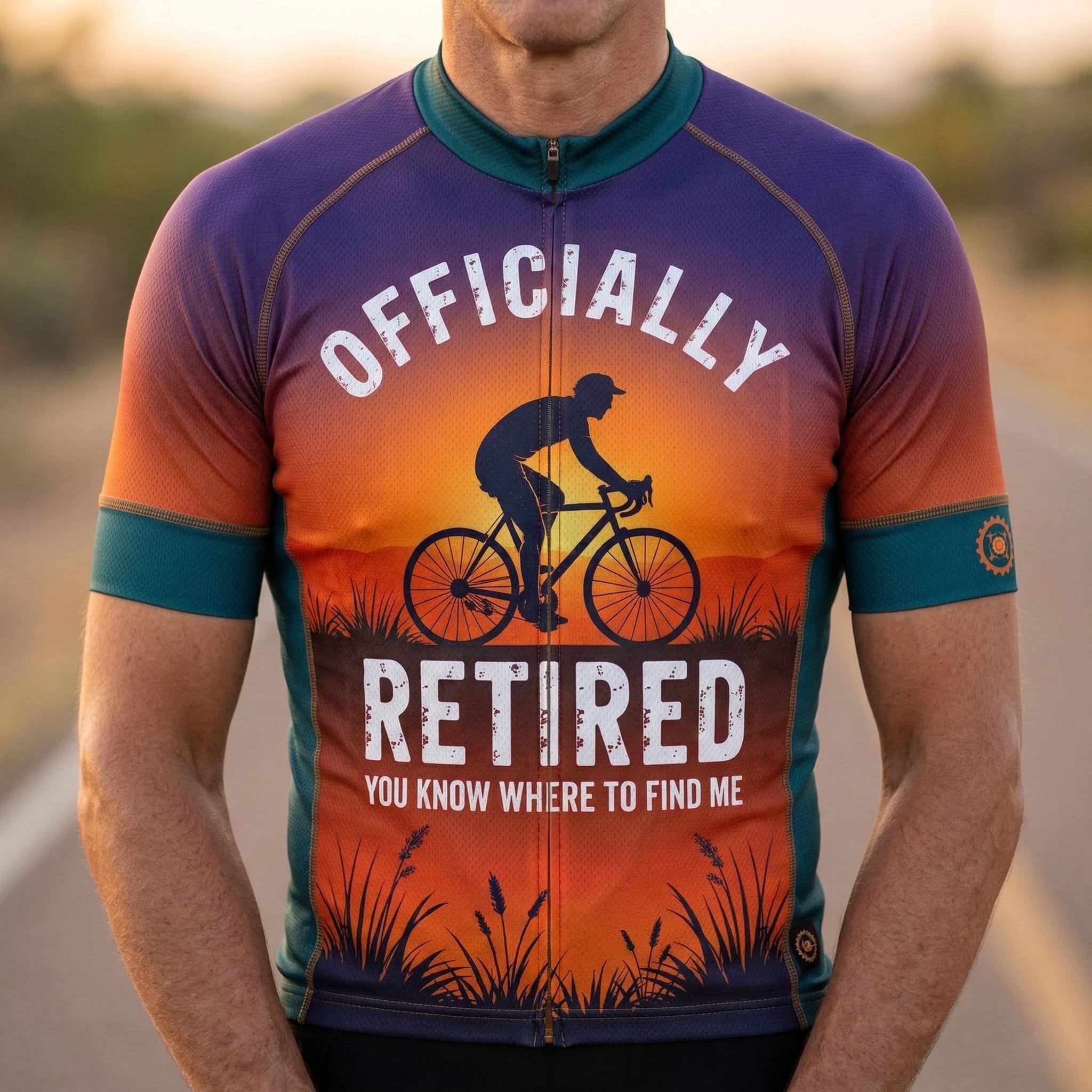 Introducing the ultimate cycling bicycle shirt for the retiree who prefers two wheels to a rocking chair! This vibrant cycling jersey features a stunning sunset design that fades from deep purple at the shoulders to a fiery orange at the waist, complete with a silhouette of a cyclist enjoying their ride. The bold white text proclaims “Officially Retired. You Know Where to Find Me,” ensuring everyone knows exactly where you’re spending your golden years.