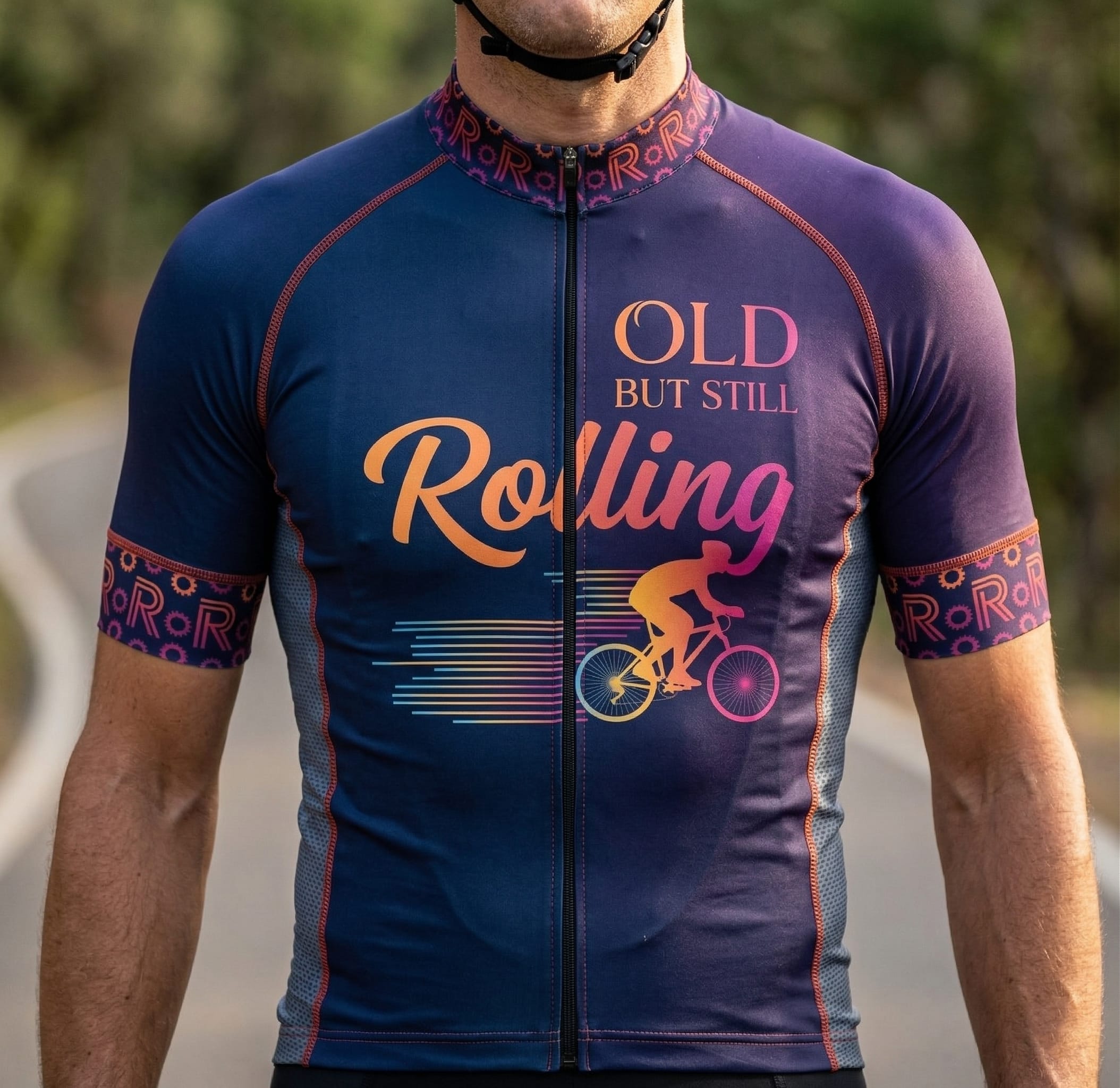 Age is just a number! Show off your passion for cycling with this unique “Old But Still Rolling” cycling bicycle shirt. This eye-catching jersey features a vibrant design with a gradient color scheme, transitioning from a deep navy to a rich purple. The words “Old But Still Rolling” are printed in a stylish orange-to-pink gradient, with a silhouette of a cyclist below. The sleeves and collar are adorned with a repeating “R” and gear pattern. The jersey also boasts a full zipper and contrasting orange stitching for added flair.