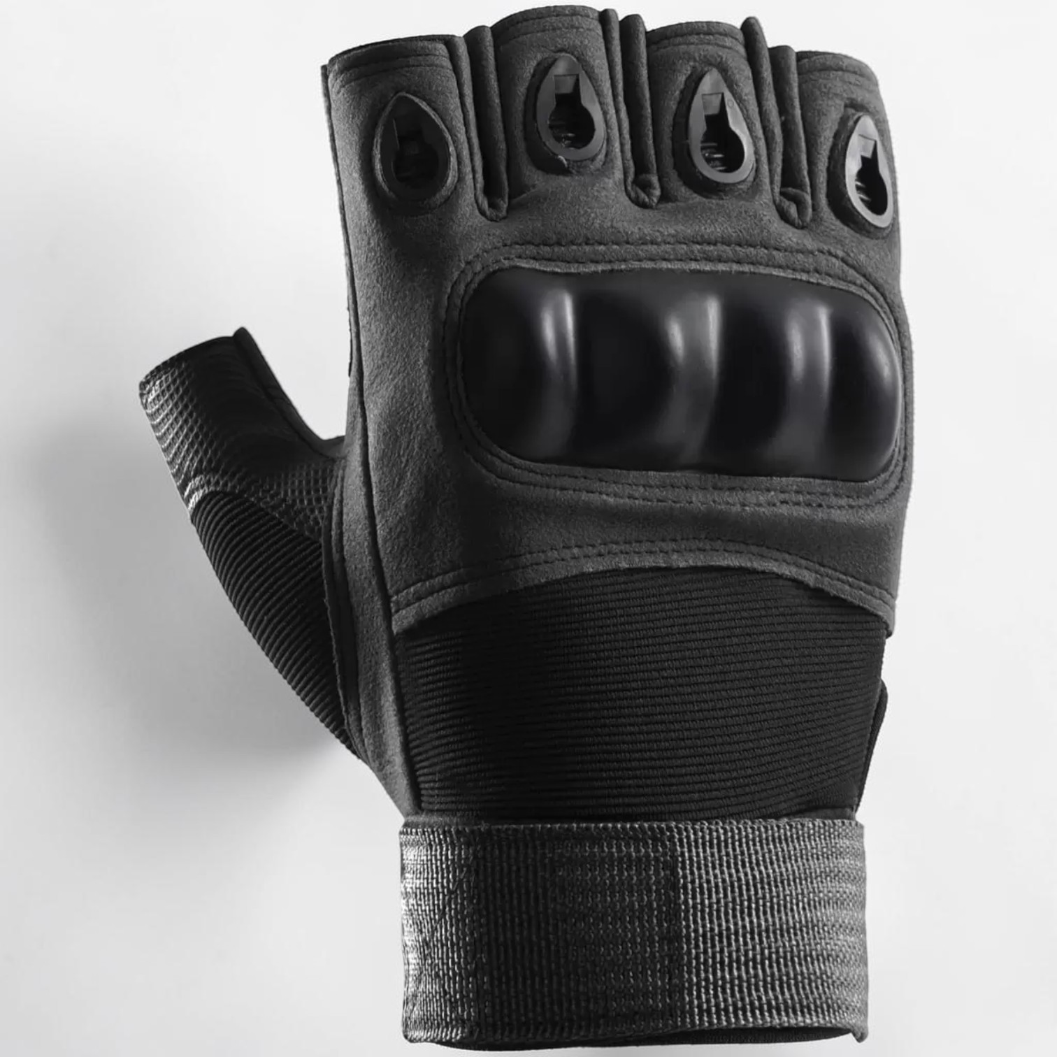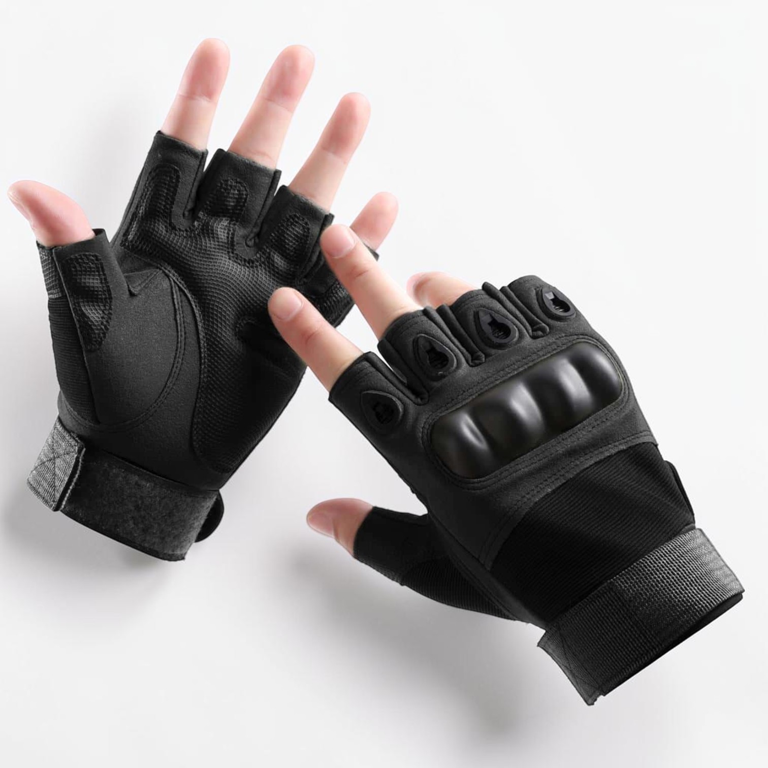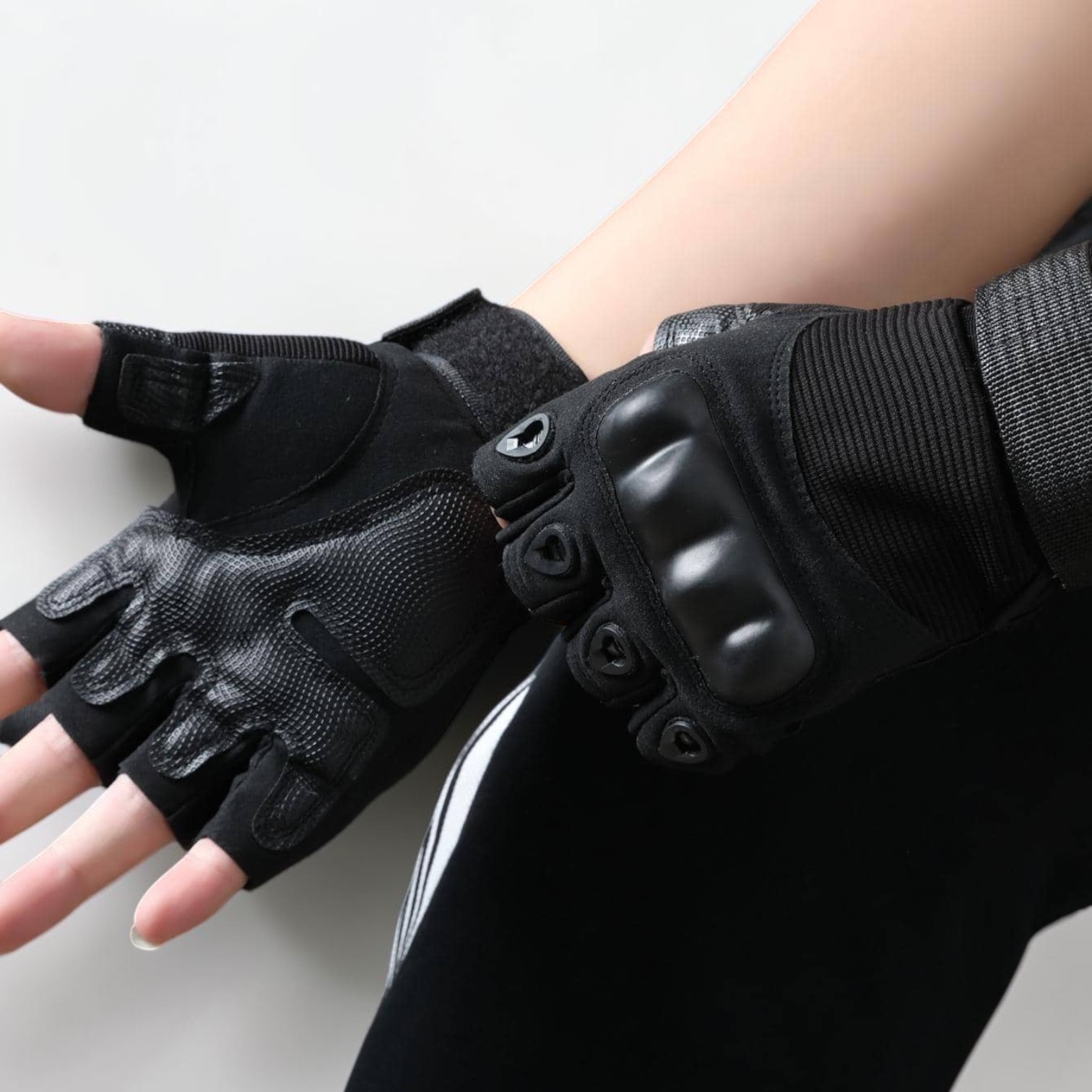 Take control of your ride with our high-performance cycling gloves! These sleek, half-finger gloves, rendered in a tactical black, not only look the part but are built to withstand the rigors of both cycling and riding motorcycles. Notice the robust knuckle protectors and reinforced palms, designed for superior grip and impact absorption. The open-finger design offers enhanced dexterity, allowing you to handle your bike or motorcycle with precision.