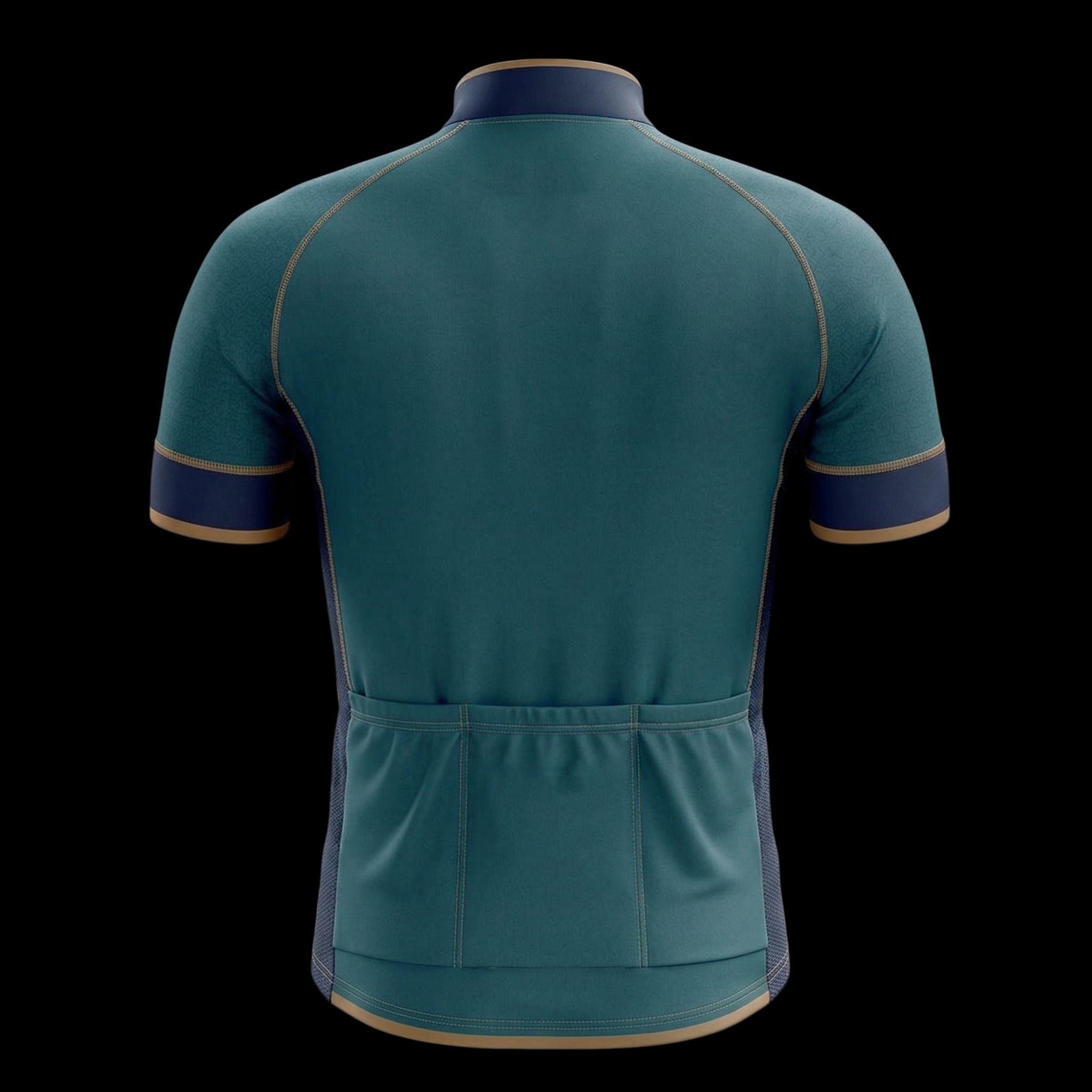 Looking for a cycling jersey that makes a statement? This “Real Men Don’t Need Motors” design is printed on a performance-focused, teal colored cycling jersey with dark navy trim. The eye-catching graphic features a cyclist riding inside a bronze cogwheel, perfect for those who believe in the power of pedal! The design is completed with two small bronze gears beneath the text “Don’t Need Motors.”