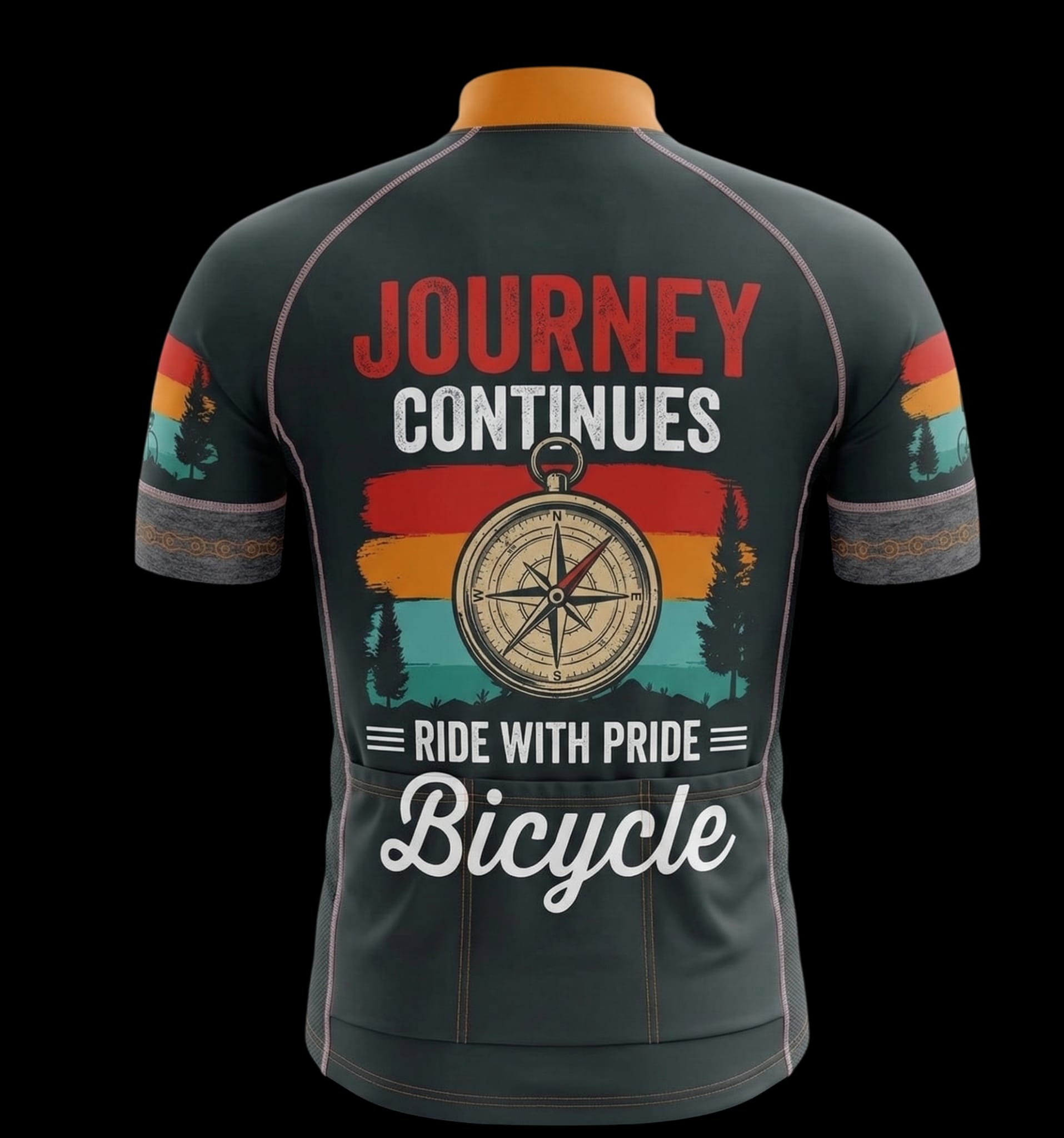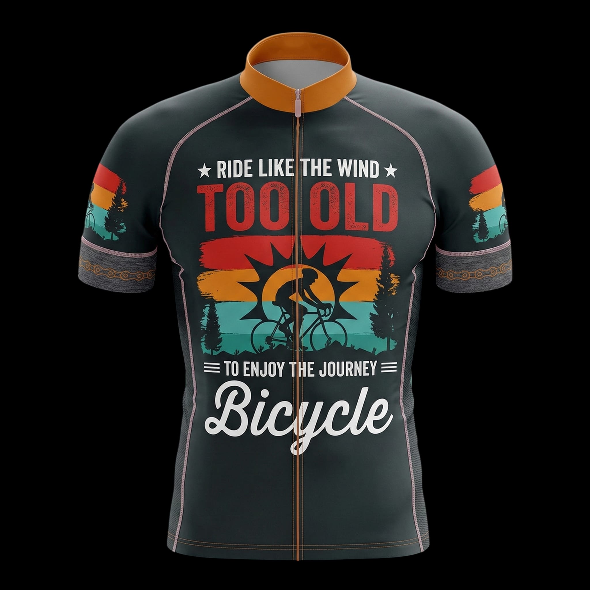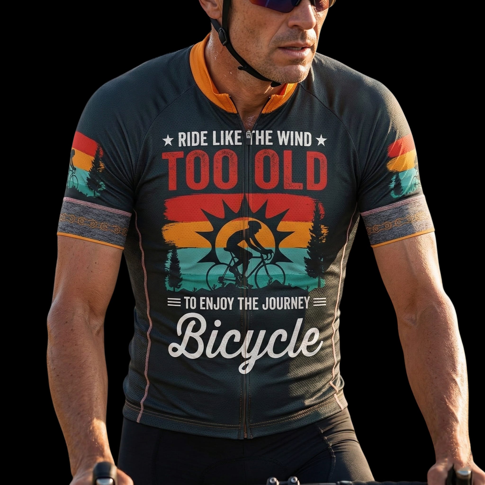 Never too old to enjoy the ride! This “Ride Like The Wind Too Old To Enjoy The Journey” cycling jersey is perfect for showing off your love for cycling. Featuring a stunning design with a silhouette of a bicycle rider against a vibrant sunset backdrop and pine trees, this cycling bicycle shirt is sure to turn heads on your next ride. The text “Ride Like The Wind,” “Too Old,” and “To Enjoy The Journey Bicycle” are printed in eye-catching fonts, making a bold statement.