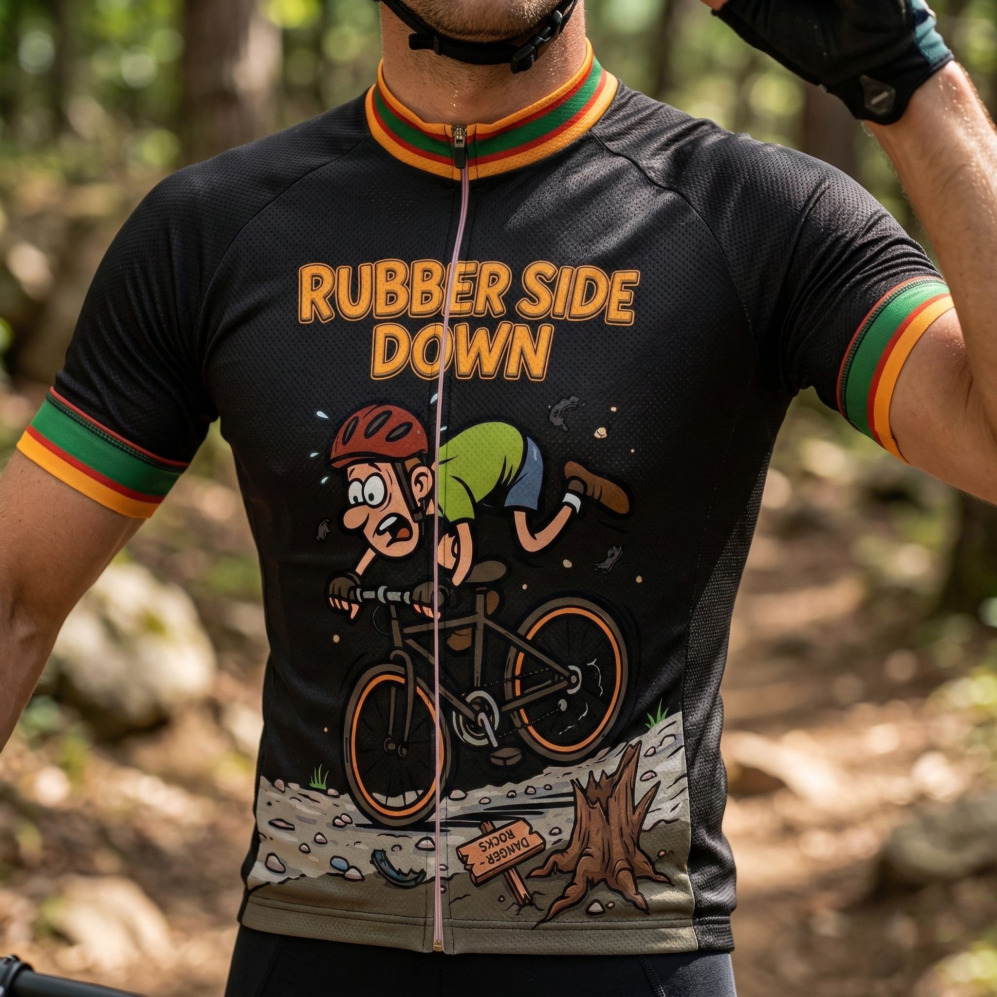 Don’t wait – grab your “Rubber Side Down” cycling jersey today and let the good times roll (or maybe tumble!). Click “Add to Cart” now and get ready to ride in style and comfort!