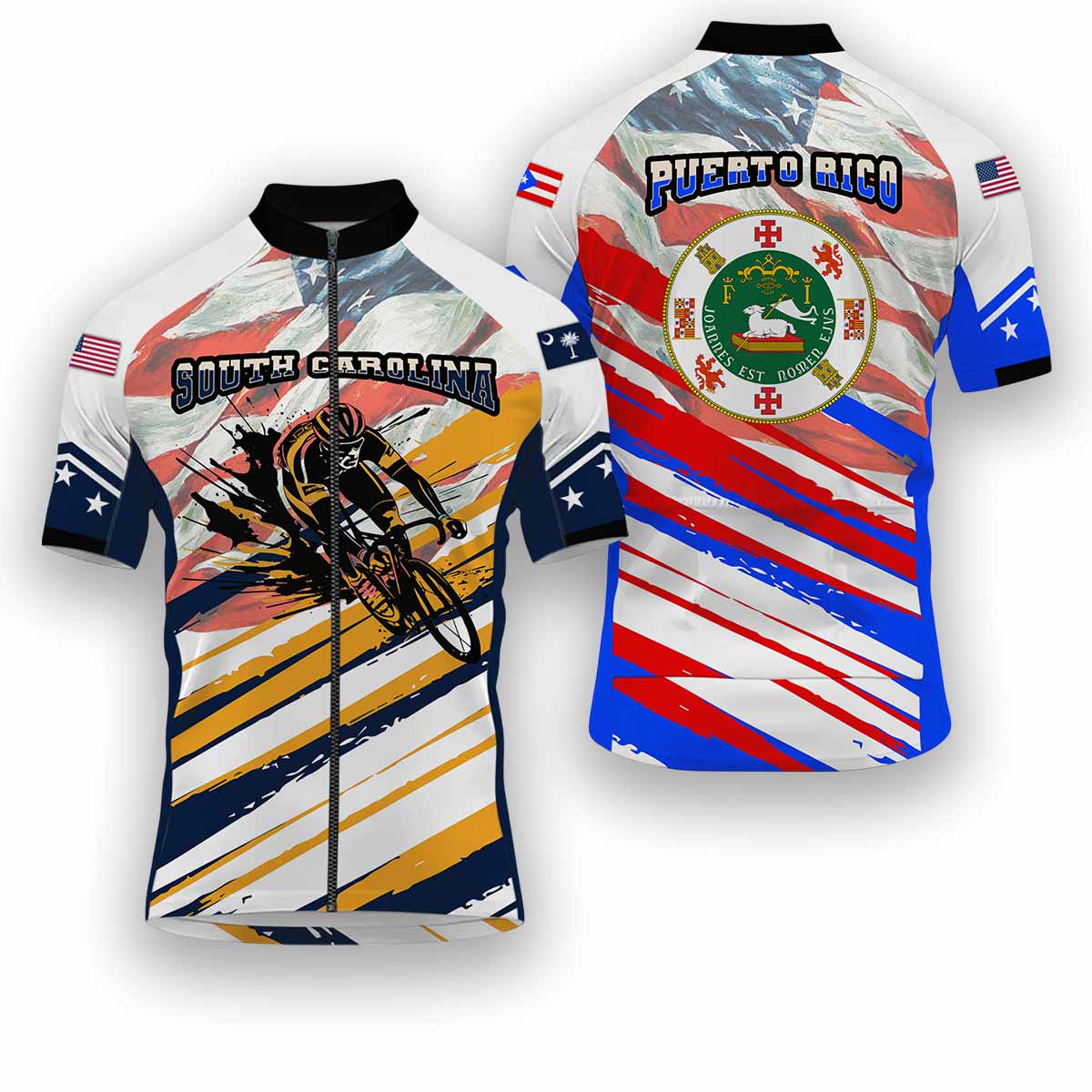 Are you a cycling enthusiast with pride for South Carolina and the USA? This premium Cycling Jersey features a vibrant USA Flag design blended seamlessly with the spirit of South Carolina. Crafted for both men and women, this full kit offers exceptional comfort and performance on every ride. Made with breathable, moisture-wicking fabric, this jersey ensures optimal temperature regulation. Show your state and national pride! Gear up and experience the difference.