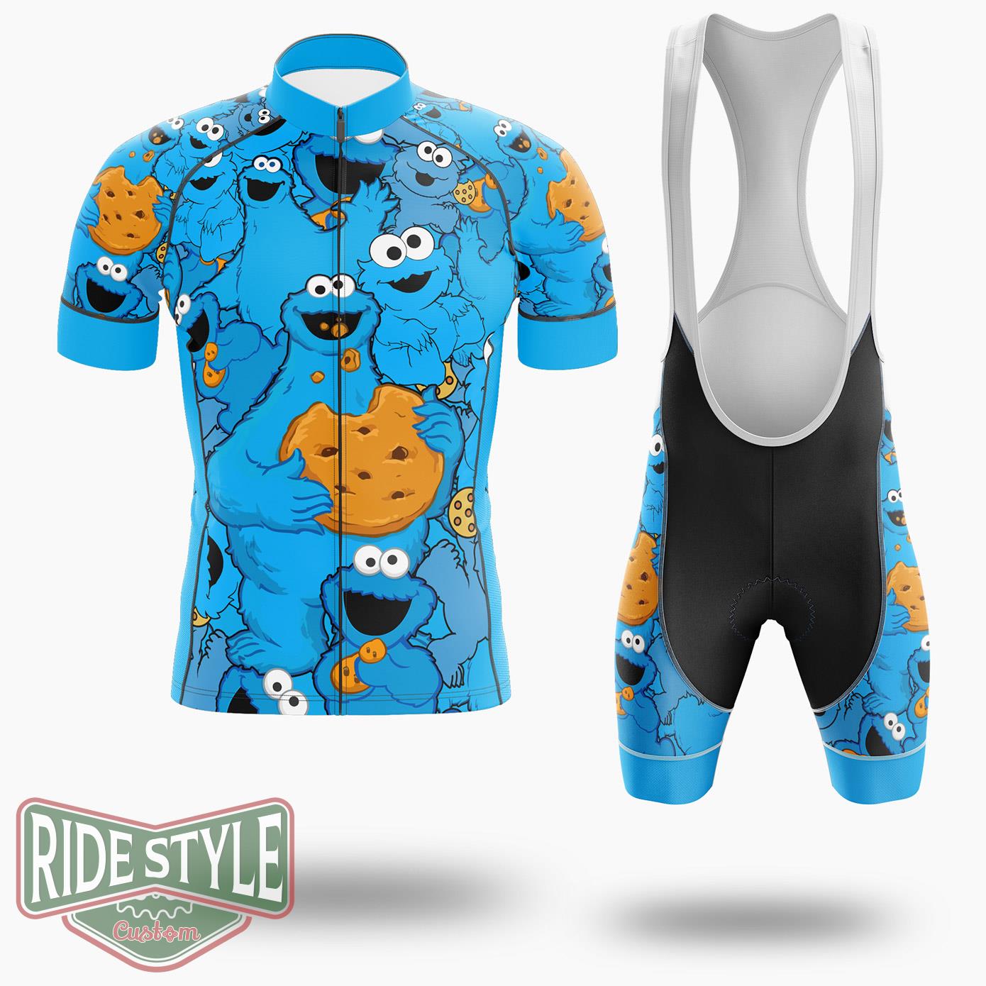 The design features a vibrant blue color scheme reminiscent of Cookie Monster. The composition balances playful elements with functional sportswear aesthetics. The kit appears to be a complete set for cycling enthusiasts.