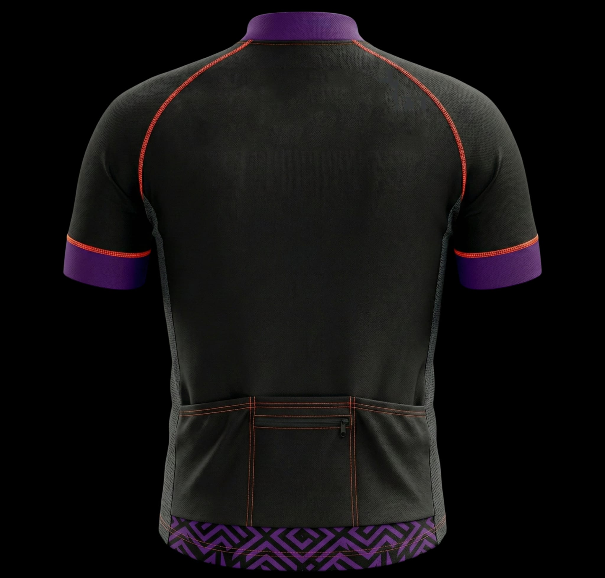 Is cycling your life? Do you eat, sleep, and breathe bikes? Then this funny cycling jersey is made for you! Featuring a vibrant, eye-catching design, this cycling bicycle shirt showcases all the things you do in your spare time – from riding and researching routes to dreaming about your next cycling adventure. The design is printed on a sleek, athletic-fit cycling jersey with black body, purple accents on the collar and sleeves and orange piping.