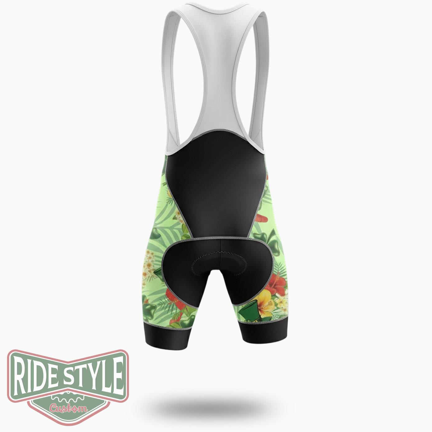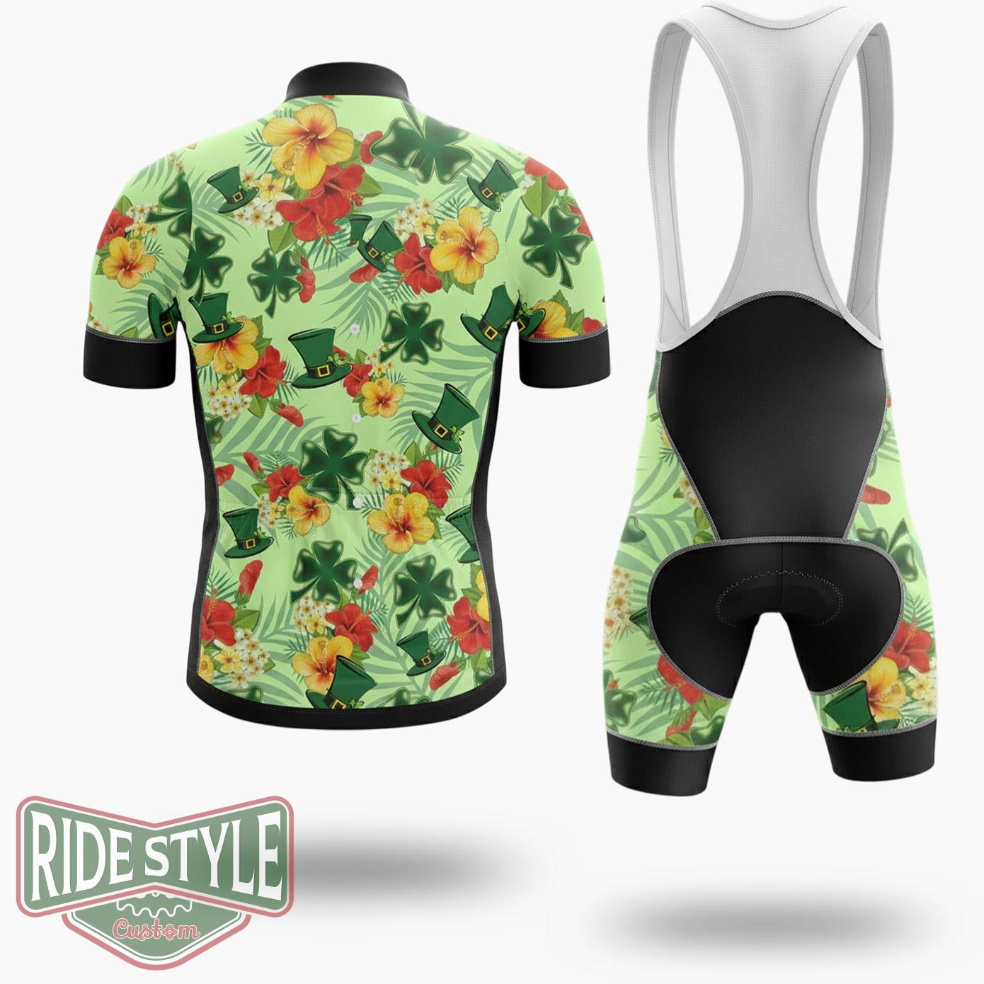 The design features a vibrant blend of tropical hibiscus flowers and traditional Irish shamrocks. The color palette incorporates greens, whites, and potentially orange hues associated with both St. Patrick’s Day and tropical themes. The composition is likely designed for visibility and performance during cycling, suggesting a focus on aerodynamics and comfort.