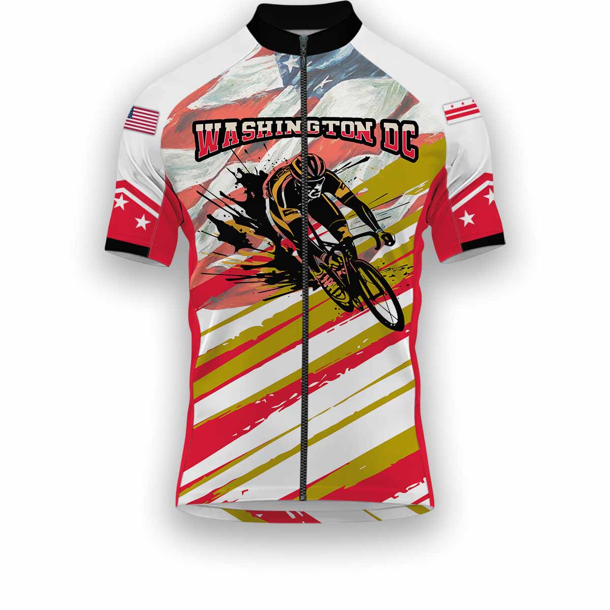 Are you a proud patriot and cycling enthusiast? Showcase your love for the nation’s capital with our Washington DC States Cycling Jersey. This premium cycling jersey features a vibrant USA Flag design, making it the perfect choice for showing your American pride on the road. This men women jersey is designed for ultimate comfort and performance, ensuring a smooth and enjoyable ride. Get the complete look with our optional full kit, including matching bib shorts. Crafted with breathable, moisture-wicking fabric, this cycling apparel will keep you cool and dry during intense rides. Order your patriotic jersey today and ride with pride!